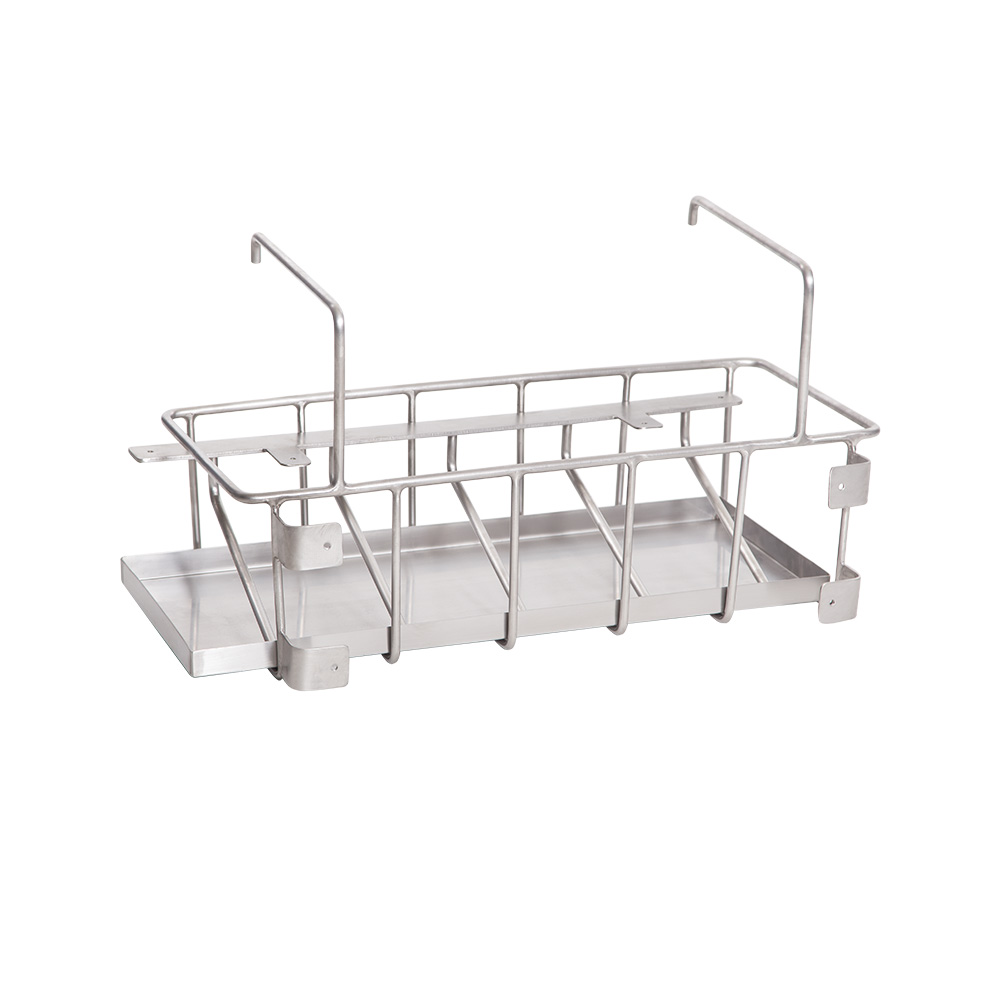 Stainless steel round bar made to hold bed pans and urinals, with stainless steel drip tray.