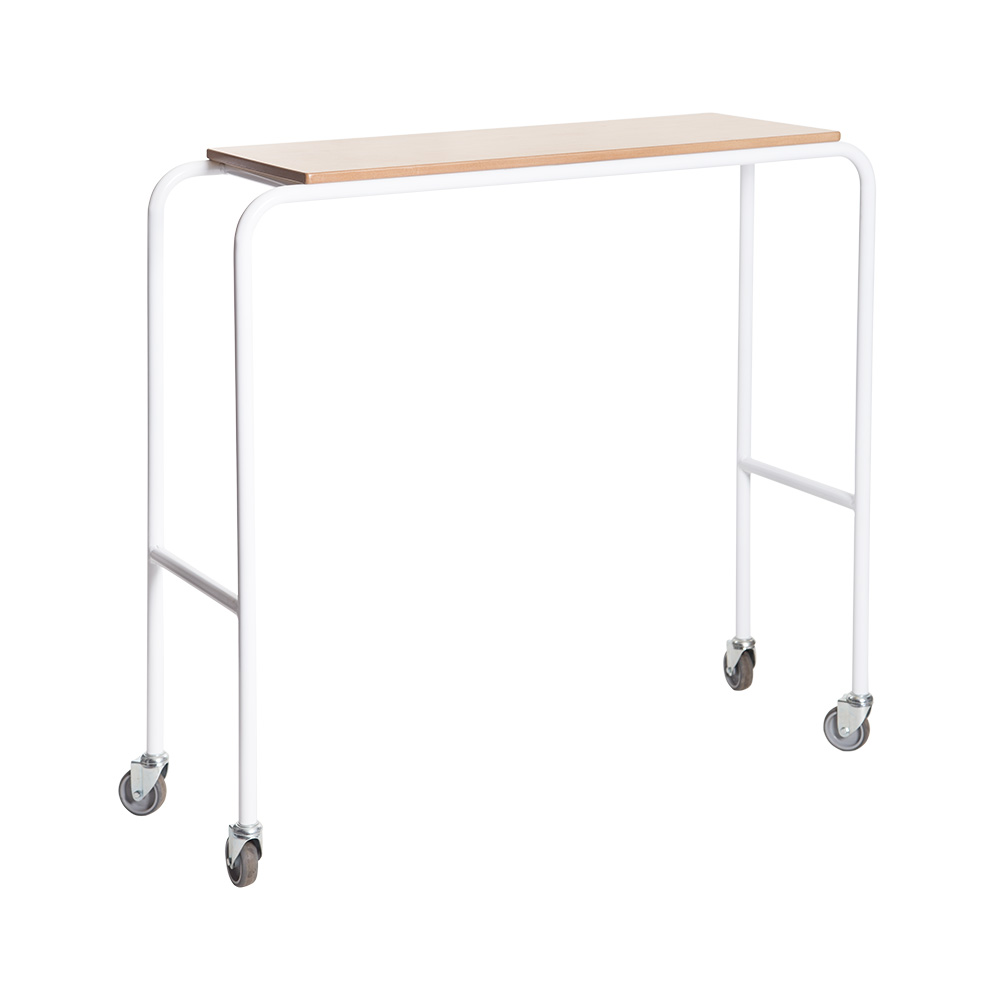 L 1090 x W 400 x H 900mm Mild steel epoxy coated frame, 4 x 75mm swivel castors, solid formica wood top.