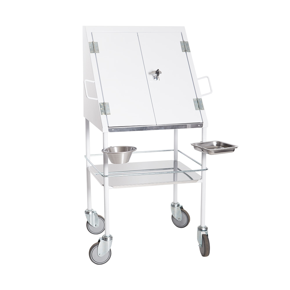 Epoxy powder coated, 2 lockable doors, writing shelf, stainless steel tray with bowl holders, stainless steel tray with galvanized rail.